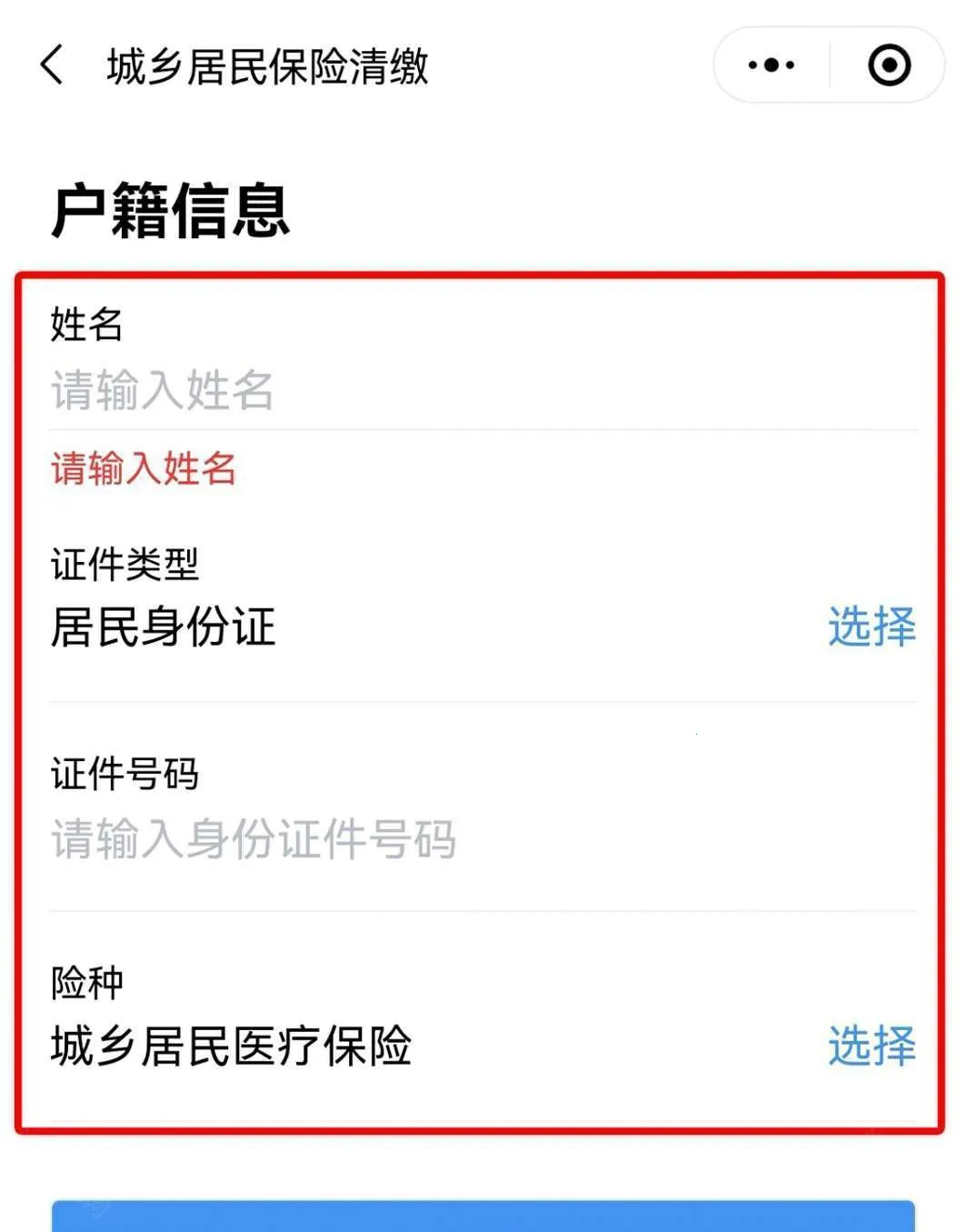 5、代他人缴费“险种”选择 “城乡居民医疗保险”,“缴费类型”选择“代他人缴费”,点击“下一步”进入“户籍信息”录入界面;