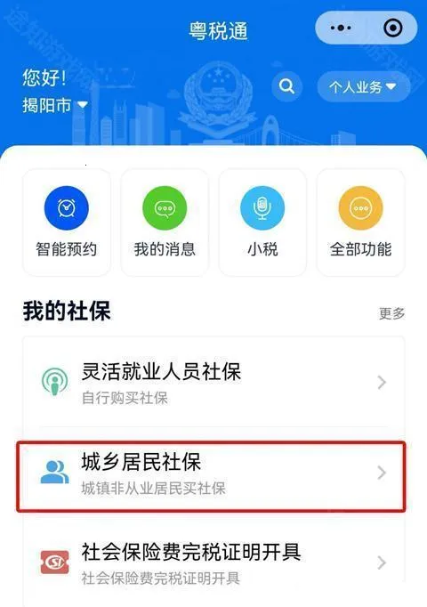 1、用户打开粤税通后,进入页面中点击【城乡居民社保】