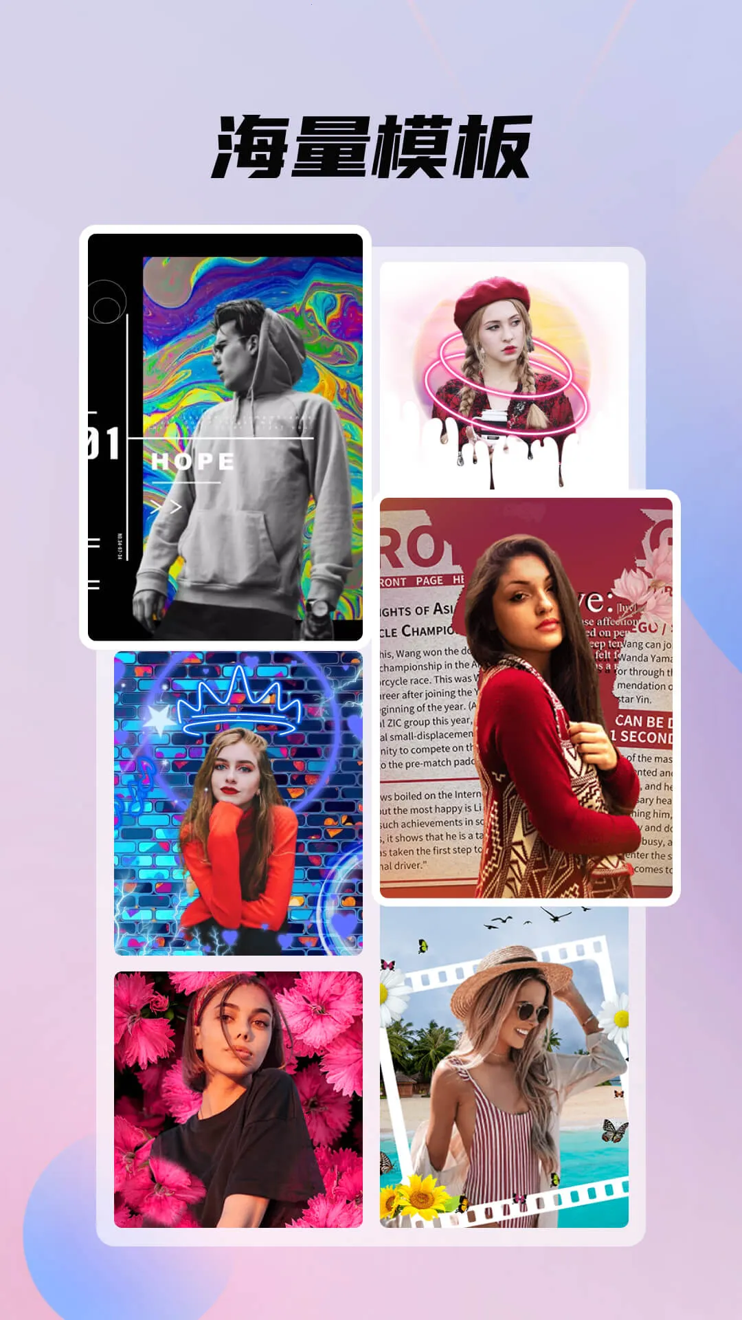 2、素材丰富:拥有海量模板,涵盖唱歌跳舞、酷炫古装、民族风等多种风格,每日上新千套模板特效,还有海量图片库,潮流酷炫背景和漫画特效模板随心换。