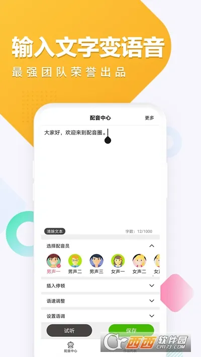 配音圈2025是一款专业的智能文字转语音工具,提供海量主播声线与方言选择。用户可在线编辑语速语调,快速合成高品质配音作品,支持MP3/MP4格式导出,完美适配各类视频剪辑,广泛应用于短视频、广告及有声读物制作。