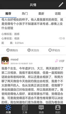 3、多样社交形式:用户可记录分享心情经历,找相同心情经历的知己,还能围绕同类心事话题交流,互相安慰鼓励。
