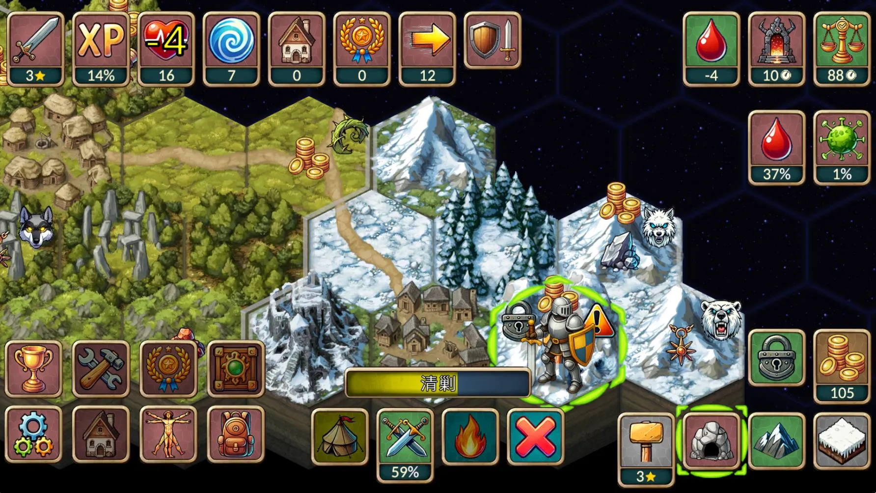 2、世界充满未知,随机生成的地图中有遗迹与地牢等待探险,玩家能自由探索,决策战逃、锻造掠夺、结盟独行等。