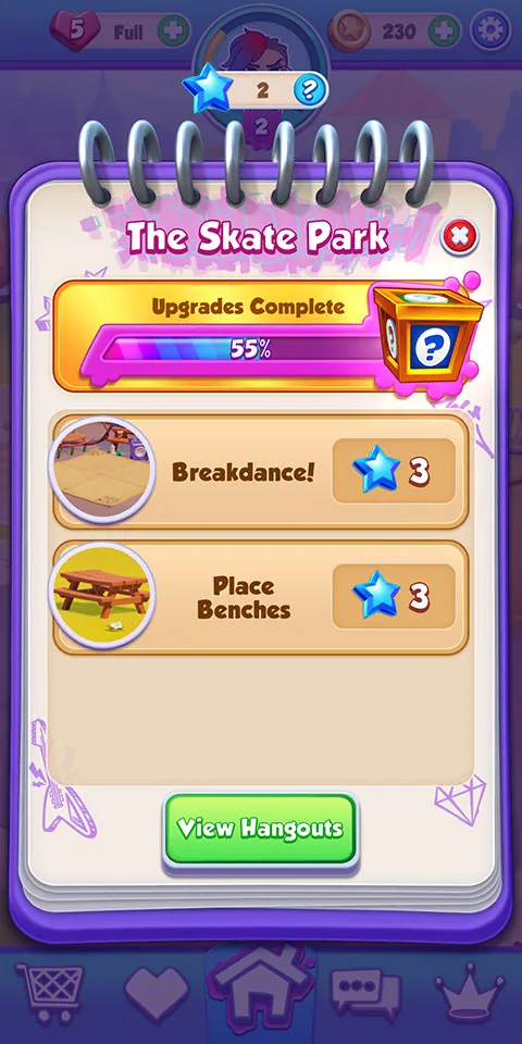 2. 探索与装饰:加入团队旅程,翻新单调休息室,扩展滑板天堂。通过消除格子、破解谜题解锁独特物品装饰聚会场所。